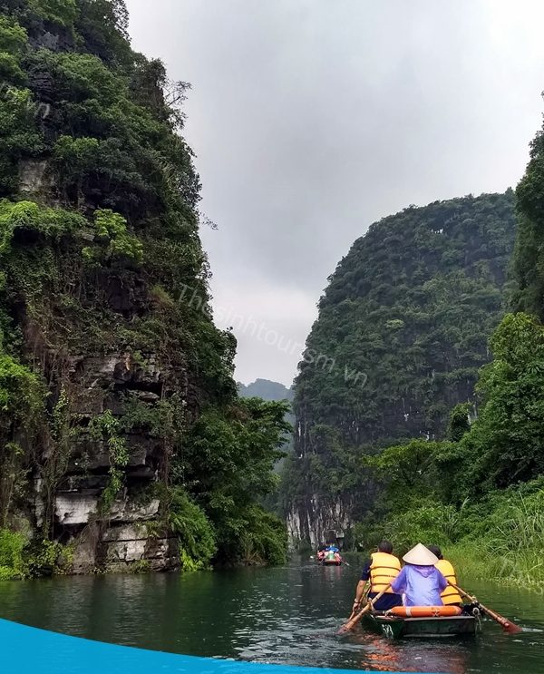 13h00: Quý khách lên xe đến thăm danh thắng Tràng An xuống thuyền xuôi dòng Sào khê uốn lượn dưới chân những dãy núi đá vôi sừng sững,cao vút tầm mắt, quanh các rừng nguyên sinh và rừng lau. Đi qua 4 hang chính với những cái tên rất lạ như: hang Lấm, hang Vạng, hang Thánh Trượt, hang Đại… du khách sẽ được trải nghiệm thưc thụ cảm giác hồi hộp khi thuyền tiến vào lòng hang sâu thẳm, chiêm ngưỡng hình thù kỳ lạ của những nhũ đá trong hang và hòa mình vào khung cảnh thiên nhiên nơi đây.